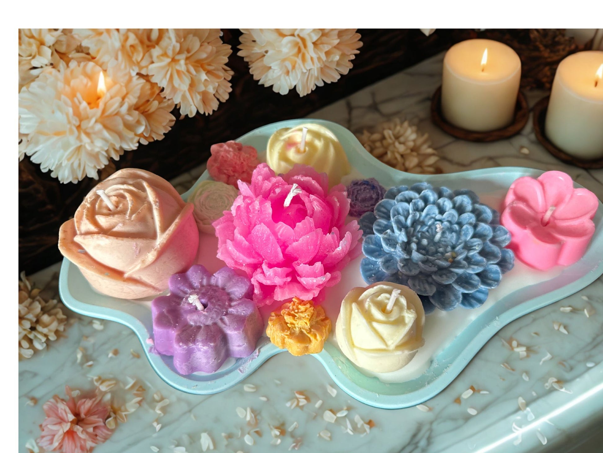 This sophisticated candle and wax melt flower arrangement is artfully displayed on a handcrafted sky blue resincrete tray measuring 11" by 7". Unscented for versatility, it offers a refined and elegant accent to any room, blending artisanal craftsmanship with timeless floral beauty.