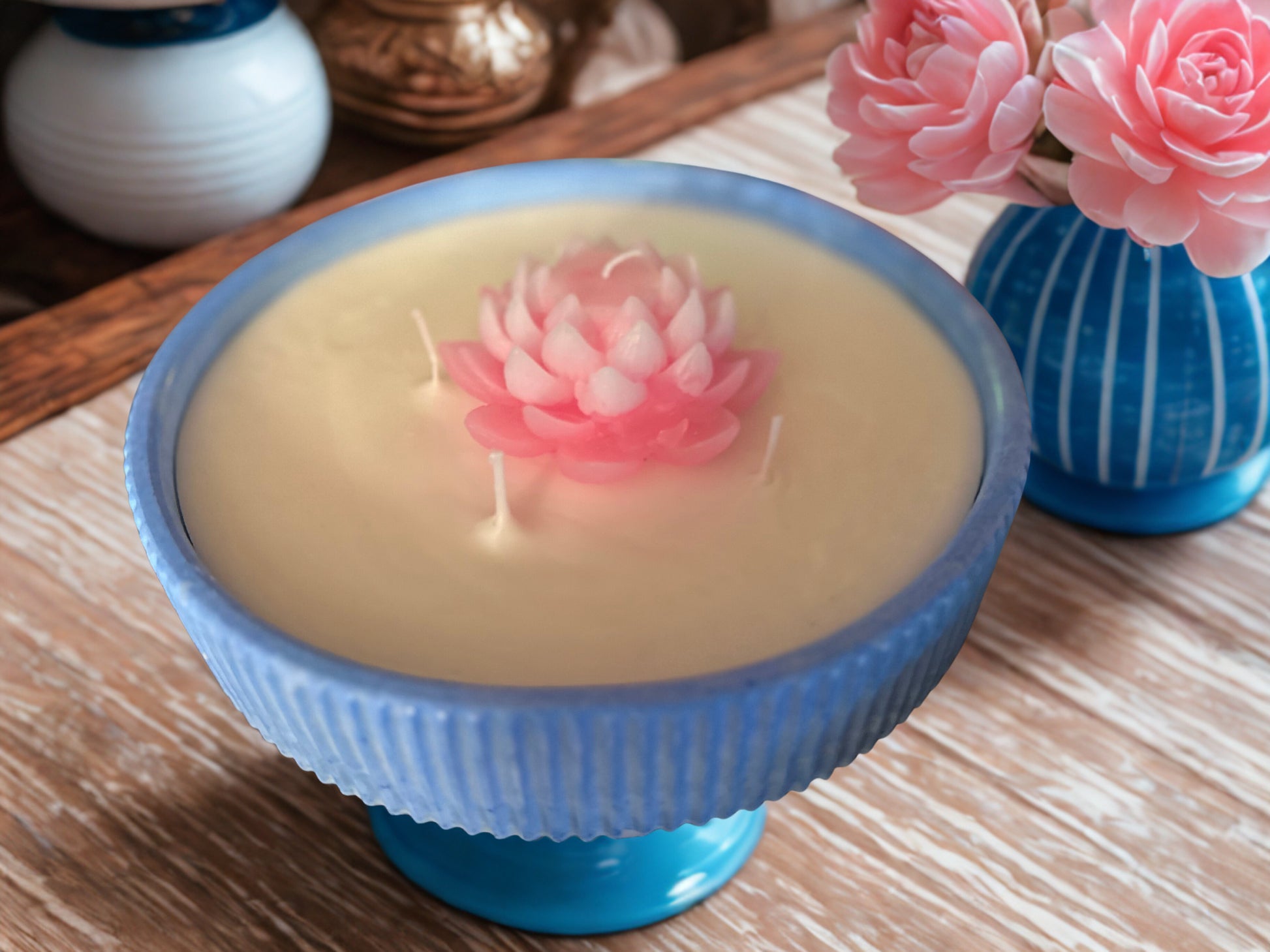 This expertly crafted large round bowl candle is made from durable resincrete, measuring 9.5" in diameter and 2" deep. It features five wicks designed to provide a balanced and consistent burn. The bowl is elegantly accented with a pink succulent candle, combining aesthetic appeal with functional design to enhance any setting with a sophisticated, ambient glow.