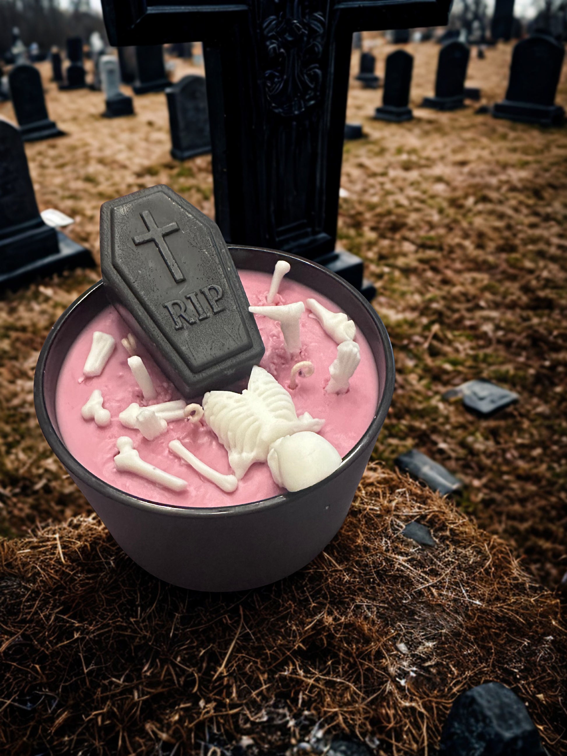 This 24 oz. candle, made with a para-soy blend and housed in a black jar, features a creepy skeleton and coffin design, perfect for Halloween. Enjoy the My Way scent and add a spooky touch to your home. Part of our Black Candle Collection.