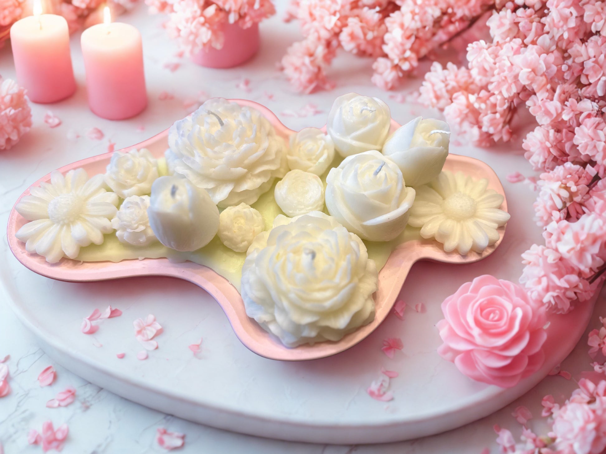 This elegant white floral candle arrangement features six delicately crafted flower head candles, complemented by daisy and small flower wax melts. Presented in a handcrafted resincrete tray measuring 11" by 7", it combines artistry and a subtle fragrance of jasmine to enhance any refined setting with a touch of natural beauty.